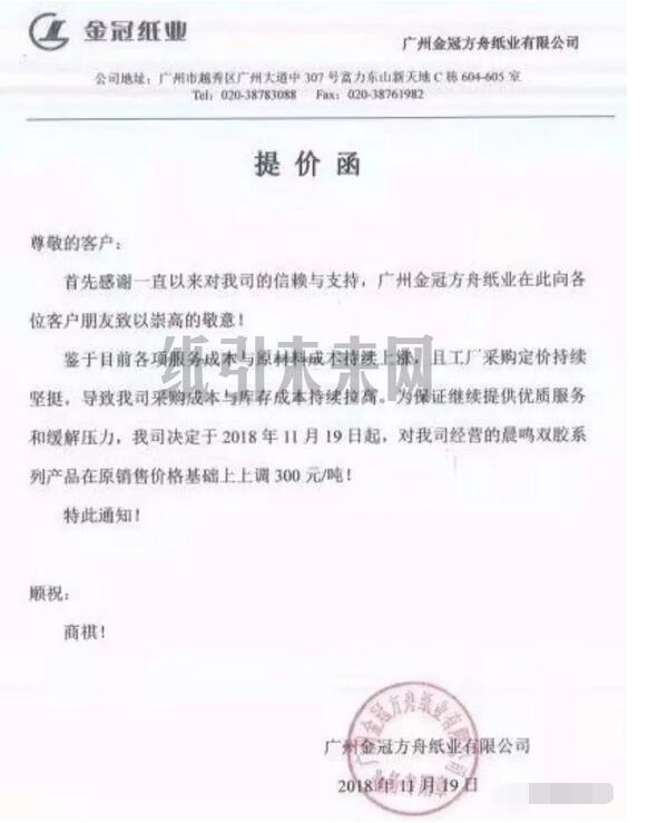 广州金冠方舟纸业有限公司:鉴于目前各项服务成本与原材料成本持续上涨,且工厂采购定价持续坚挺,我司决定11月19日起,对我司经营的晨鸣双胶系列产品在原销售价基础上上调300元/吨。