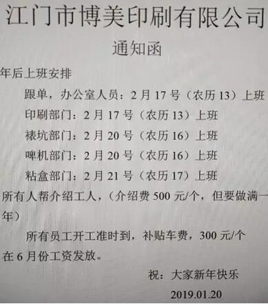 江门市博美印刷有限公司:年后上班安排:跟单、办公室人员2月17日上班,印刷部门2月17日上班,裱坑部门2月20号上班,啤机部门2月20日上班,粘盒部门2月21日上班。