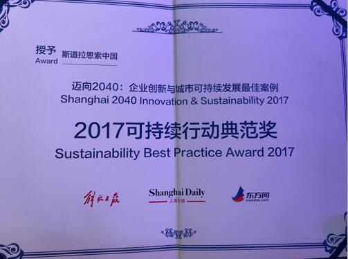 2017年9月8日,由上海市政府新闻办、上海市商委和环保局发起,由解放日报、东方网和上海日报共同主办的“迈向2040:企业创新和城市可持续发展力”案例评选活动获奖企业名单揭晓。斯道拉恩索凭借“智能包装与可再生材料”的案例荣获“2017可持续行动典范奖”,是唯一一家可再生材料领域的获奖企业。