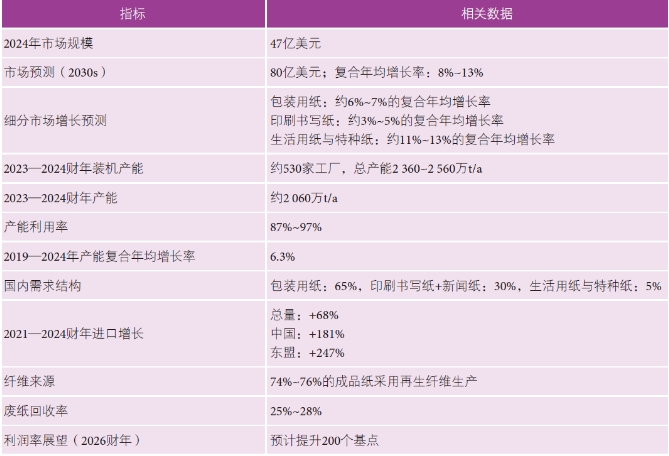 1 市场动态与增长驱动因素 2019—2024 年,印度制浆造纸行业保持着约6.3%的复合年增长率。尽管人均纸张消费量相对较低(约15 kg,全球平均水平为57 kg),但结构性需求驱动因素依然强劲。得益于新教育政策的实施及政府出版物数量增加,印刷书写纸需求稳步增长。包装用纸占总成品纸需求的65% 左右,在消费品、电子商务及物流行业增长的支撑下持续占据主导地位(见表1)。生活用纸及特种纸虽在体量上仍属细分领域,但正在成为增长最快的品类,预计未来10 年的复合年增长率达11%~13%。 表1 印度造纸行业的关键指标数据及未来趋势