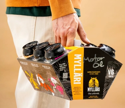 奥露亩 (Olutmylly) 是一家位于芬兰福尔萨(Forssa)的家族酿酒厂。自2020年品牌重塑以来,企业敏锐地意识到,在竞争激烈的市场中脱颖而出不仅需要优质产品,更要在货架上“吸睛”。幸运的是,奥露亩与芬林纸板的创意包装设计团队展开合作,最终呈现出令人惊艳的成果。 奥露亩总经理安妮·西尔马拉(Anne Silmälä)笑着说: 我们的新品啤酒品鉴包装绝对是最酷的六瓶装!这款包装不仅展示了我们精选的六款啤酒,更将品牌形象提升到了一个新高度。它在视觉和功能上都非常出色,我第一次看到设计方案时就被震撼到了。这个创意非常独特,而最终呈现的效果也完全符合我们最初设定的高标准。 酿酒师米科·西尔马拉(Mikko Silmälä)也表示: 这次合作是一次彻底的成功。罐装啤酒被包装得像引擎活塞一样,啤酒的选择也非常精致。 芬林纸板包装平面设计师马尔科·莱维斯卡(Marko Leiviskä)则称这次合作是“天作之合”。他回忆道: 从2024年12月提出初步构想开始,我们的进展非常迅速。小型企业在包装解决方案方面更具灵活性,也更愿意在设计上大胆突破,这次合作正是如此。 引擎造型,点燃激情! 莱维斯卡的设计灵感源自汽车引擎——一个V型结构,正好容纳六瓶啤酒。他说:“我觉得这个设计会深受那些喜欢改装汽车、偶尔小酌的人群欢迎。后来我发现奥露亩的客户中就有不少来自赛车圈,这一切仿佛都是命中注定。我们成功打造了一款专属特定人群的产品。”