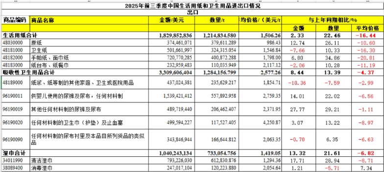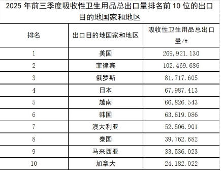 进口 2025年前三季度,生活用纸总进口量比2024年同期增长,但进口量很少,仅有约3.57万t。进口的生活用纸以原纸为主,占总进口量的91.2%。 吸收性卫生用品 2025年前三季度,中国吸收性卫生用品出口量持续增长,进口量则不断下滑,这主要是由于国内吸收性卫生用品产能增长、品质提升,对进口产品的需求下降。 出口 2025年前三季度,吸收性卫生用品的总出口量达128.42万t,同比增长13.39%,婴儿纸尿裤在吸收性卫生用品出口量中占比最大,占总出口量的43.44%。吸收性卫生用品的出口金额达33.10亿美元,同比增长8.44%。 女性卫生用品、婴儿纸尿裤、成人失禁用品的出口量均有不同程度的增长,但宠物垫、护理垫等卫生用品出口对应的商品编码48189000(纸浆、纸等制的其他家庭、卫生或医院用品)下的产品出口量同比下降7.59%。分析原因是美国加征关税对我国二、三季度出口带来一定的影响,该编码下产品出口目的地排名第一的美国的出口量由2024年前三季度的93.095.289t,下降到2025年前三季度的73.015.091t。