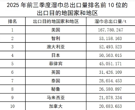 进口 2025年前三季度,吸收性卫生用品进口量仅有1.90万t,同比减少3.3%,进口量连续多年降低。其中,婴儿纸尿裤的进口量同比下降21.44%,至8.056.549t,在各类吸收性卫生用品中降幅最大。 湿巾 2025年前三季度,中国湿巾出口量大幅增长,出口产品以清洁湿巾为主,进口量与上年同期基本持平,但总量较少,湿巾出口量远高于进口量。 出口 2025年前三季度,湿巾的出口总量为73.31万t,同比大增21.61%。出口产品以清洁湿巾为主,出口量占比约为83.60%。