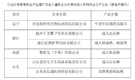 2025年10月29日,工信部正式公布了《2025年老年用品产品推广目录》,丹东欣时代、杭州千芝雅、浙江亿维、福建婴舒宝、山东爱舒乐、山东世纪通6家成人纸尿裤、护理垫、湿巾等产品生产企业入选名单。