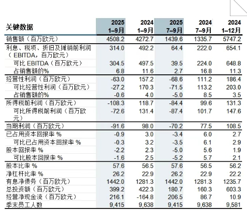 2025年1-9月 (2024年1-9月同比数据) 销售额为45.08亿欧元(同比:42.73亿欧元) 经营性利润为亏损6300万欧元(同比:盈利1.57亿欧元),可比经营利润为亏损2700万欧元(同比:盈利1.7亿欧元) 税前利润为亏损1.08亿欧元(同比:盈利1.19亿欧元),可比税前利润为亏损7300万欧元(同比:盈利1.31欧元) 可比已占用资本回报率为 -0.3%(同比:3.2%) 经营性净现金流为2.16亿欧元(同比:-1.65亿欧元) 2025年7-9月 (2024年7-9月同比数据) 销售额为14.40亿欧元(同比:13.36亿欧元) 经营性利润为亏损 6900万欧元(同比:盈利1.11亿欧元),可比经营性利润为亏损7200万欧元(同比:盈利1.13亿欧元) 税前利润为亏损 8400万欧元(同比:盈利1.0亿欧元),可比税前利润为亏损 8700万欧元(同比:盈利1.02亿欧元) 可比已占用资本回报率为 -3.5%(同比:6.1%) 经营性净现金流为2.07亿欧元(同比:8700万欧元) 2025年第三季度主要事件 万友熙(Jussi Vanhanen)于 2025年7月1日正式就任芬林集团总裁兼首席执行官。 欧洲及中国市场对商品浆的需求疲软。芬林集团已暂时缩减其约策诺(Joutseno)木浆厂的生产。 与第二季度相比,芬林集团针叶商品浆的平均销售价格在欧洲下降了 5%,在中国下降了 7%。 芬林集团纸板交付量较上季度略有下降,平均销售价格保持稳定。受市场环境影响以及释放营运资金的需求影响,芬林集团对纸板生产进行了缩减。此外,工厂停机维护及芬兰辛佩莱(Simpele)投资项目的停产亦对产量及盈利能力造成影响。 2025年第三季度的经营业绩受芬兰凯米生物制品厂气体爆炸事故相关事项的影响:其中包括 3000 万欧元的保险赔偿收入,以及因资产受损而计提的 2200 万欧元减值损失。 鉴于持续的盈利能力疲软及市场前景不确定,芬林集团启动了重大成本节约及盈利改善计划的筹备工作,目标为年节省成本 3 亿欧元。