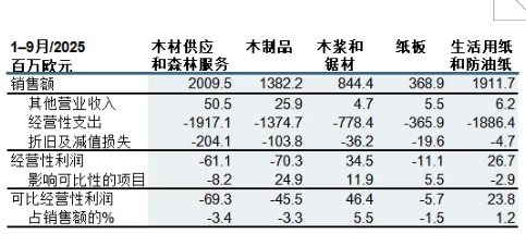 总裁兼首席执行官万友熙(Jussi Vanhanen)表示: 芬林集团 2025 年第三季度财务表现的亮点是经营活动产生的现金流,净额为正并超过 2 亿欧元。尤其是在纸板业务方面,为降低营运资金而采取的相关措施按计划顺利实施。 正如预期,第三季度的经营业绩录得明显亏损。造成该结果的主要原因是木浆市场——尤其是在中国——价格低迷,以及美国市场纸板业务量的下降。这两项因素均可归因于春季全球贸易中出现的保护主义趋势。美国对中国加征关税,直接影响了中国的木浆需求,导致订单暂停进而引发木浆价格下跌。在第三季度,芬林集团的木浆产品交付量较上一季度的低谷有所回升,但仍低于第一季度的水平。中国市场的价格水平尚未恢复,木浆业务的疲弱业绩表现印证了这一趋势。 美国加征的关税对芬林纸板的业绩造成了明显冲击。自春季订单量骤降以来,美国市场的订单流入仅出现有限回升。由于当地市场环境限制,集团未能提高客户价格以抵消关税带来的影响。上述因素,加之浆价低迷,尤其影响了芬林纸板瑞典胡苏姆(Husum)工厂的盈利能力。辛佩莱和胡苏姆工厂的年度停机维护亦进一步削弱了纸板业务的盈利水平。 在生活用纸业务方面,第三季度的业绩较上一季度及去年同期均有所改善,主要得益于交付量的增加以及成本的下降。另一项积极进展是,芬林集团位于瑞典玛丽斯塔德(Mariestad)的新生活用纸厂已按计划于第三季度开始向客户交付。 木制品业务的盈利能力下降主要由两个因素导致:一是正在进行的 ERP 系统更新过程中出现的问题,尤其影响了英国升级木材业务的交付能力,造成客户流失及赔偿支出;二是如预期所示,芬兰苏赫拉蒂(Suolahti)工厂在逐步停产过程中,运营效率亦受到影响。芬林集团此前已宣布该工厂将于 2026 年底关闭。位于芬兰艾内科斯基(Äänekoski)的新 LVL 工厂建设项目按计划稳步推进。 第二季度开始的木材价格下跌趋势在第三季度持续,并反映在木材交易量的减少上。木材价格的下降将在本年度最后一个季度对芬林集团的业绩产生轻微影响,并将在 2026 年带来更为显著的影响。尽管如此,北欧地区的木材价格仍处于历史高位。芬林集团的木材资源储备保持在良好水平。今年以来,林业服务的销售实现了强劲增长。 芬林集团需继续改善其业务表现。因此,我们于今年七月宣布启动一项成本节约计划的筹备工作,目标为节省成本 3 亿欧元。目前,该计划筹备工作已完成。大部分成本节约将通过优化可变成本实现。预计相关节约成果将自 2026 年初起逐步反映在业绩中,并于 2027 年全面显现成效。作为成本节约计划的一部分,我们于十月初宣布启动集团各事业部范围内的法定协商程序,拟永久减少共 800 个固定岗位。这一决定对我们敬业的员工而言无疑是令人痛心的,但遗憾的是,这是我们为实现业绩根本性改善所必须采取的措施之一。 关键数据