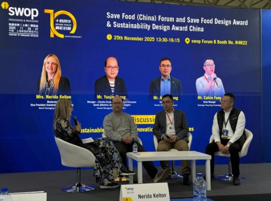 11月25日,欧洲领先的优质原生纤维纸板生产商芬林纸板亮相上海世界包装展(SWOP 2025),大中华区销售总监钟渊作为嘉宾参与2025节约粮食(中国)论坛的专家讨论环节,主题为“可持续包装创新与技术”,由世界包装组织(WPO)可持续发展与节约食品副总裁Nerida Kelton女士主持。