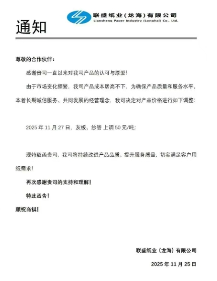联盛纸业(龙海)有限公司 2025年11月27日,灰板、纱管上调50元/吨。