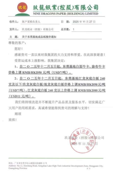玖龙天津基地: 自十二月五日起,天津基地灰底白板纸、白面牛卡、涂布牛卡价格上调50元/吨。