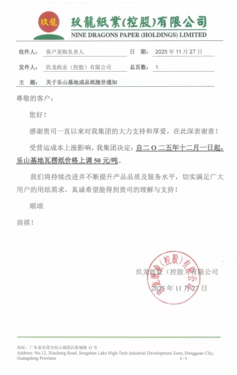 玖龙乐山基地: 自十二月一日起,乐山基地瓦楞纸价格上调50元/吨。