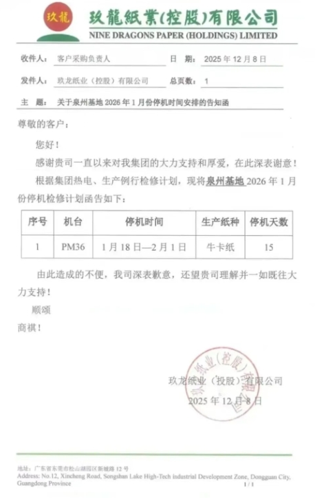 玖龙纸业泉州基地的PM36将从1月18日停机至2月1日,预计减产箱板纸1.3万吨。此外,玖龙北海基地的PM48将在1月底减产约2.6万吨箱板纸。