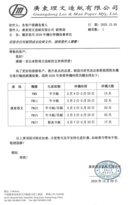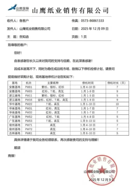 三家龙头纸企宣布停机计划,预计2026年初减产约27万吨包装纸