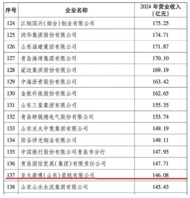 12月16日,山东省企业联合会、山东省企业家协会联合发布了《2025山东大企业发展研究报告》和2025山东企业200强、工业企业100强等名单。其中,亚太森博(山东)浆纸有限公司位列2025山东企业200强第137位,2025山东工业企业100强第99位。 据了解,为全面贯彻党的二十大和二十届历次全会精神,落实省委、省政府关于加快培育更多世界一流企业的要求,进一步促进企业做大做强做优,山东省企业联合会在连续二十年组织开展山东大企业发展研究工作基础上,参照国际通用惯例,结合我省实际,依据企业2024年营业收入年报数据(企业集团为合并报表数据),经企业自愿申报、山东省企业联合会组织审核筛选,确定2025山东大企业名单,并形成《2025山东大企业发展研究报告》。