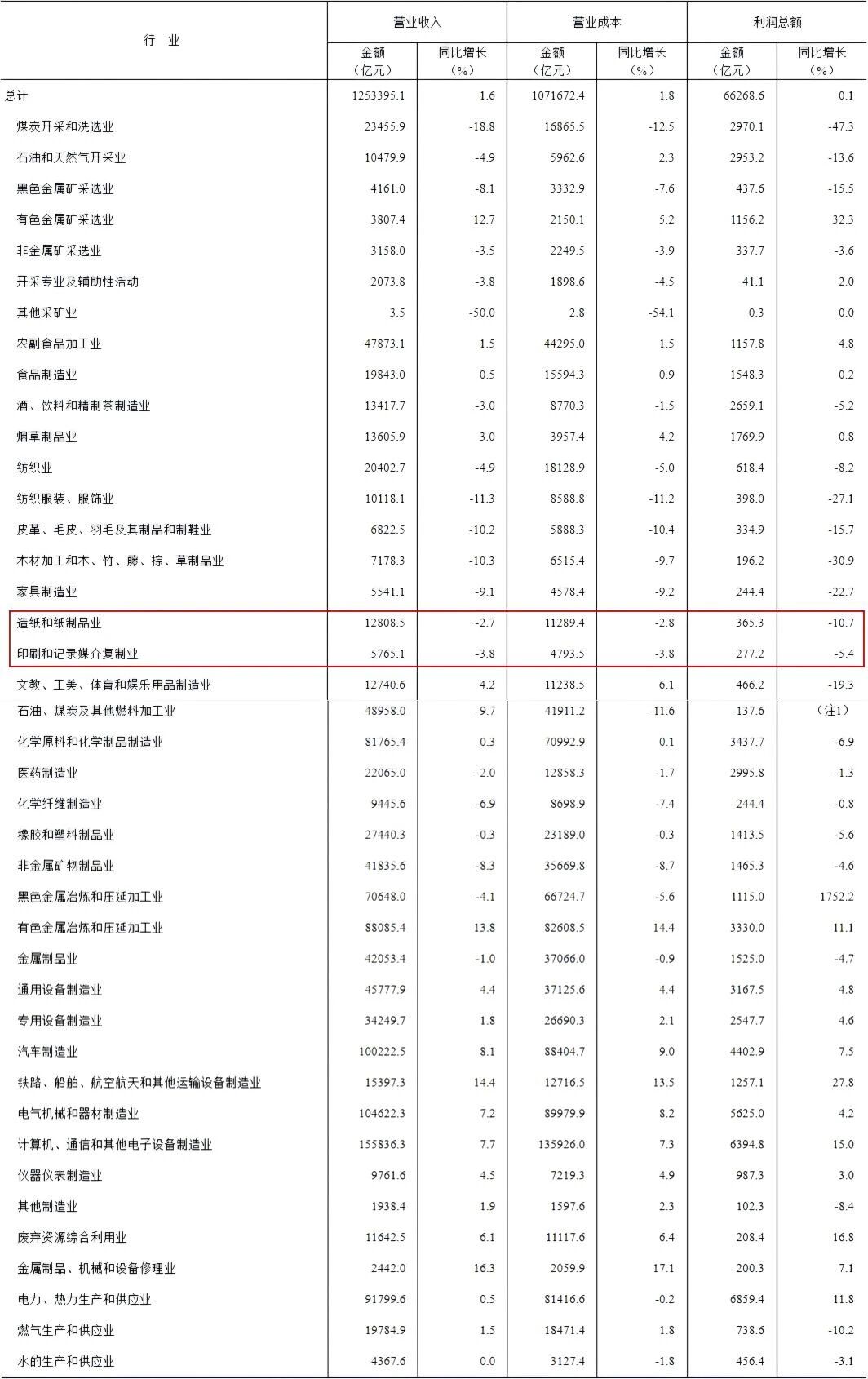 数据显示,2025年1-11月份,全国规模以上工业企业实现利润总额66268.6亿元,同比增长0.1%。其中,造纸和纸制品业实现利润总额365.3亿元,同比下降10.7%;印刷和记录媒介复制业实现利润总额277.2亿元,同比下降5.4%。 在营业收入方面,规模以上工业企业实现营业收入125.34万亿元,同比增长1.6%。其中,造纸和纸制品业实现营业收入12808.5亿元,同比下降2.7%;印刷和记录媒介复制业实现营业收入5765.1亿元,同比下降3.8%。
