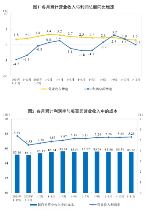 国家统计局工业司首席统计师于卫宁解读2025年1—11月份工业企业利润数据 1-11月份,规模以上工业企业利润增速有所回落,但仍然延续8月份以来的增长态势,以装备制造业、高技术制造业为代表的新动能行业保持较快增长,工业经济转型升级有序推进。 工业企业利润和营业收入保持增长。1-11月份,规模以上工业企业利润同比增长0.1%,自今年8月份以来累计增速连续四个月保持增长。从三大门类看,1-11月份,制造业增长5.0%;电力、热力、燃气及水生产和供应业增长8.4%;采矿业下降27.2%,降幅较1—10月份收窄0.6个百分点。1-11月份,规模以上工业企业营业收入同比增长1.6%。 装备制造业利润带动作用明显。1-11月份,规模以上装备制造业利润同比增长7.7%,拉动全部规模以上工业企业利润增长2.8个百分点,是对规模以上工业企业利润增长拉动作用最强的板块。从行业看,装备制造业的8个大类行业中有7个行业利润实现同比增长,其中,铁路船舶航空航天、电子行业利润两位数增长,增速分别达27.8%、15.0%;汽车行业利润增长7.5%,较1-10月份加快3.1个百分点;通用设备、专用设备、电气机械行业利润继续增长,增速分别为4.8%、4.6%、4.2%。 高技术制造业利润增速加快。1-11月份,规模以上高技术制造业利润同比增长10.0%,较1-10月份加快2.0个百分点,增速高于全部规模以上工业平均水平9.9个百分点。从行业看,“人工智能+”行动深入实施带动相关设备制造行业利润向好,电子工业专用设备制造行业利润同比增长57.4%,其中半导体器件专用设备制造、电子元器件与机电组件设备制造行业利润分别增长97.2%、46.0%;航空航天产业快速发展推动行业利润增长较快,航空、航天器及设备制造行业利润同比增长13.3%,其中航天相关设备制造、航空相关设备制造行业利润分别增长192.9%、36.3%;智能化产品助力数智化转型,智能消费设备制造行业利润同比增长54.0%,其中智能车载设备制造、智能无人飞行器制造、其他智能消费设备制造行业利润分别增长105.7%、76.6%、58.1%。 原材料制造业利润较快增长。1-11月份,规模以上原材料制造业利润增长较快,同比增速达16.6%,拉动全部规模以上工业企业利润增长2.0个百分点。从行业看,自今年以来,钢铁行业盈利状况改善明显,叠加低基数因素,行业利润同比大幅增长;在市场需求增加、营收增长较快的带动下,有色行业利润保持两位数增长。 总体看,规模以上工业企业利润延续增长态势,工业新动能的支撑作用进一步显现。但也要看到,国际环境不稳定不确定因素较多、工业新旧动能转换仍面临结构调整压力,工业企业效益恢复基础还需继续巩固。下阶段,要全面贯彻落实中央经济工作会议精神,推动传统产业改造升级,大力培育新质生产力,加快建设现代化产业体系,推动工业经济持续健康发展。