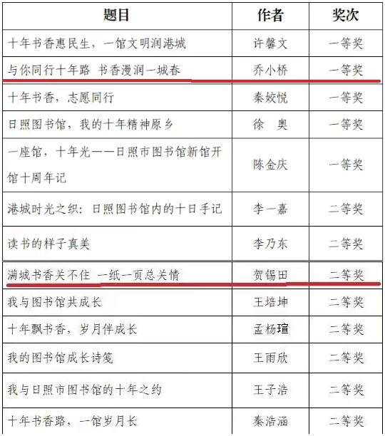 为进一步深化广大读者与日照图书馆之间的情感联接,增强图书馆作为“精神家园”的归属感,日照图书馆特开展“十年书香路,一馆岁月长”主题征文。近日,征文获奖名单公布,公司员工乔小桥作品《与你同行十年路 书香漫润一城春》、贺锡田作品《满城书香关不住 一纸一页总关情》榜上有名,分别获得一等奖和二等奖。