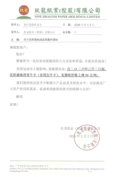 自三月二日起,沈阳基地所有牛卡(含再生牛卡)、瓦楞纸价格上调 50元/吨。