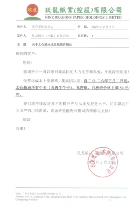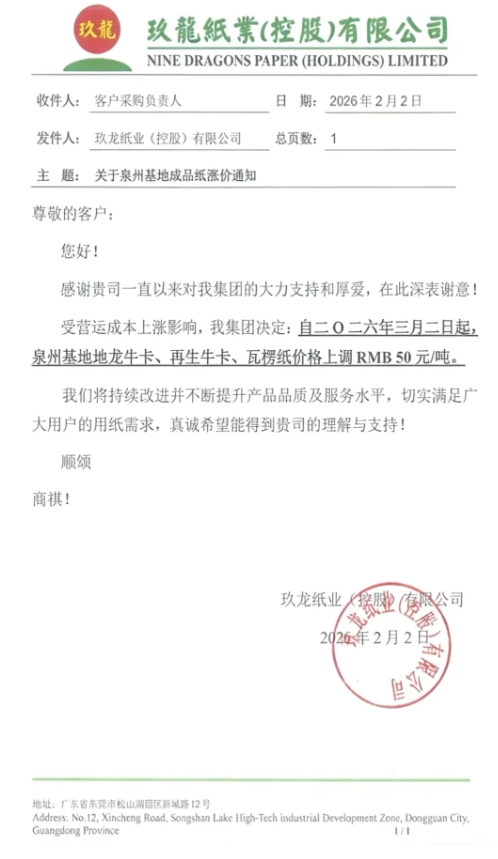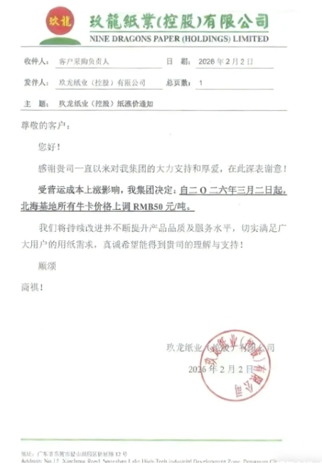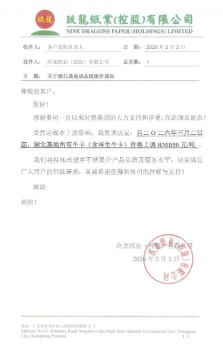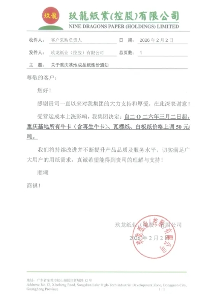 随着春节临近,受终端订单释放、纸企减产与下游纸板厂库存低位等多重因素影响,市场供需格局发生变化,瓦楞纸市场展现出企稳回升迹象。近日,纸业巨头玖龙九大基地再发调价通知,自三月二日起,牛卡、瓦楞纸等纸种价格普遍上调50元/吨。