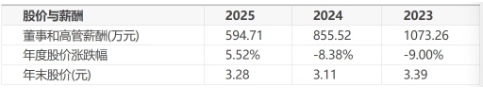 近三年董事和高级管理人员薪酬方面,2023年薪酬总额为1073.26万元,2024年薪酬总额为855.52万元,2025年薪酬总额为594.71万元。从2023年到2025年,董事和高管薪酬总额减少478.55万元,降幅44.59%。 冠豪高新公司股价从2023年末的3.39元,到2025年末的3.28元,跌幅3.33%。