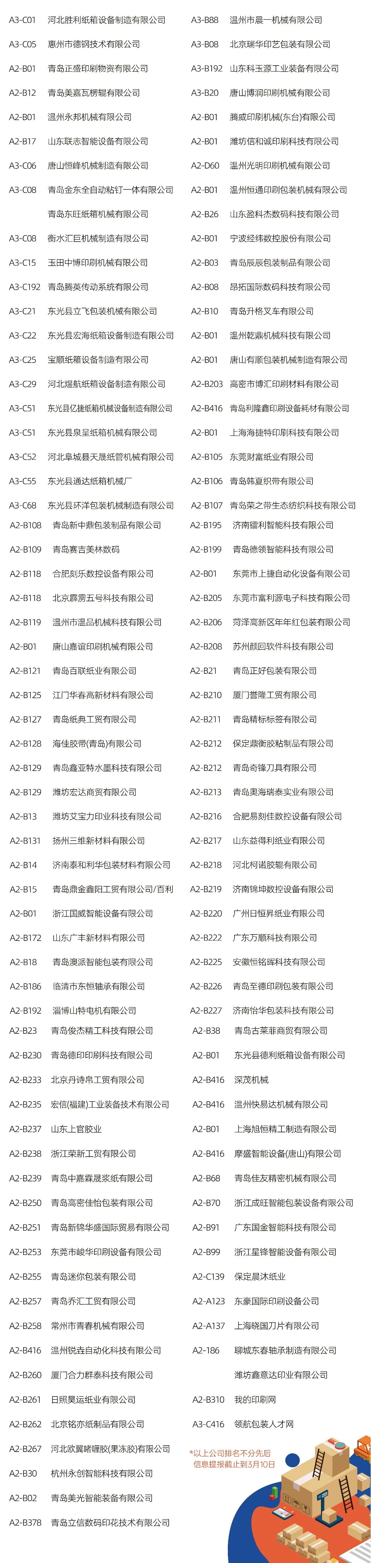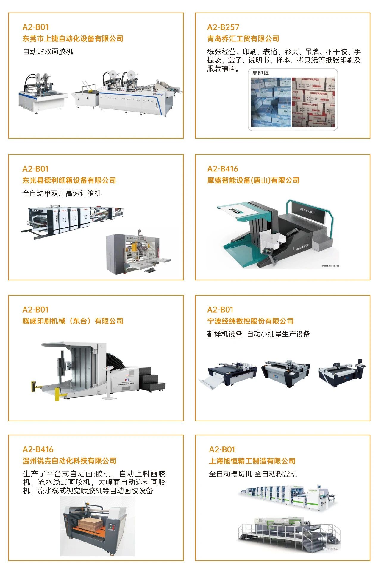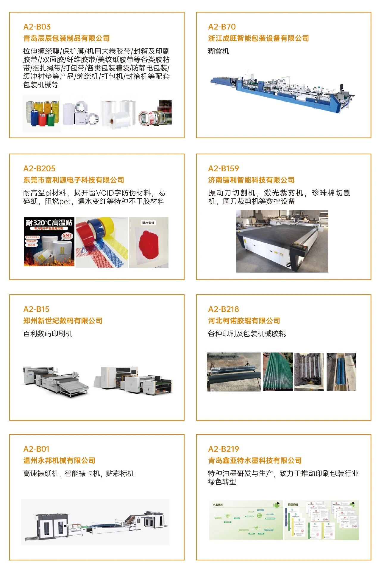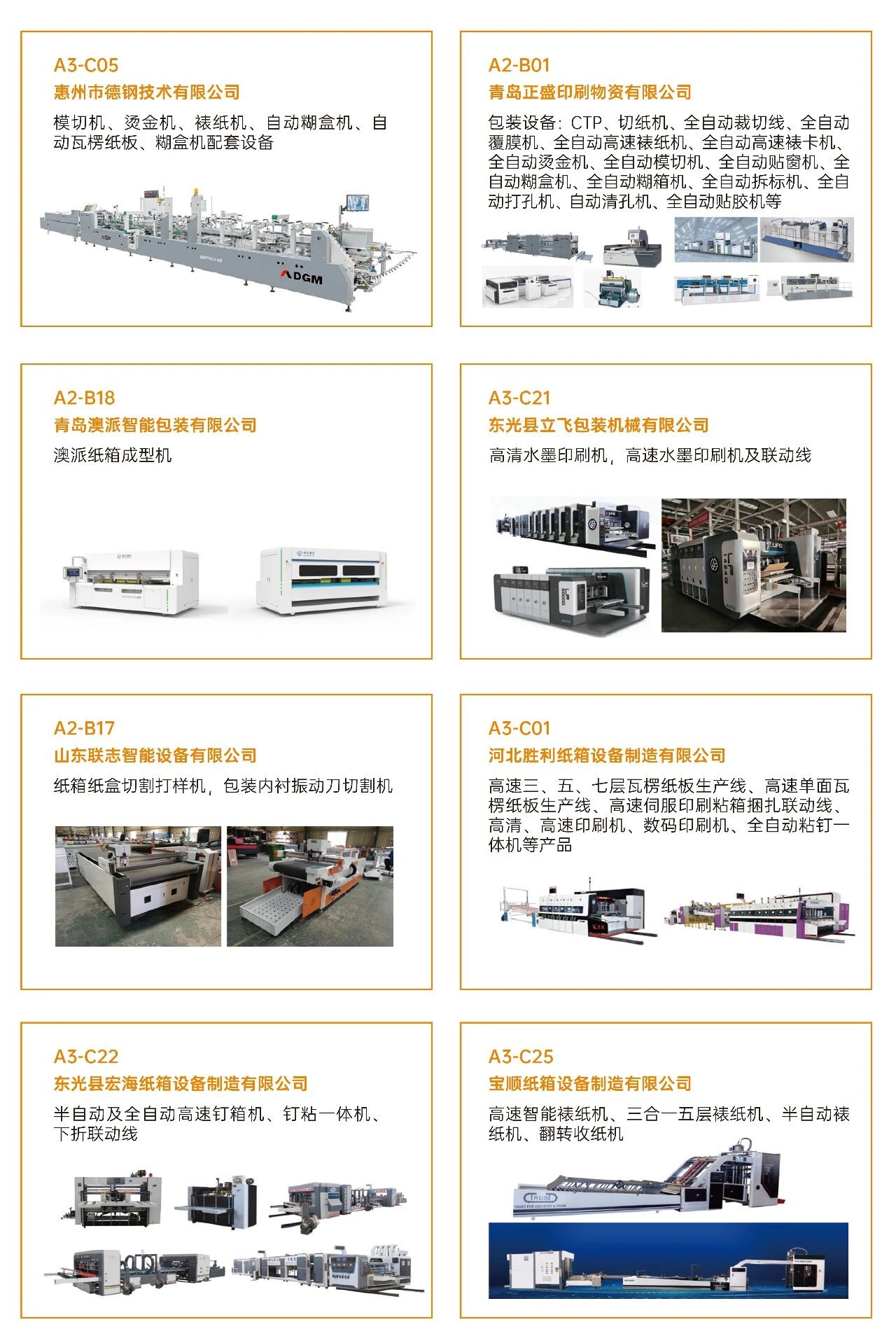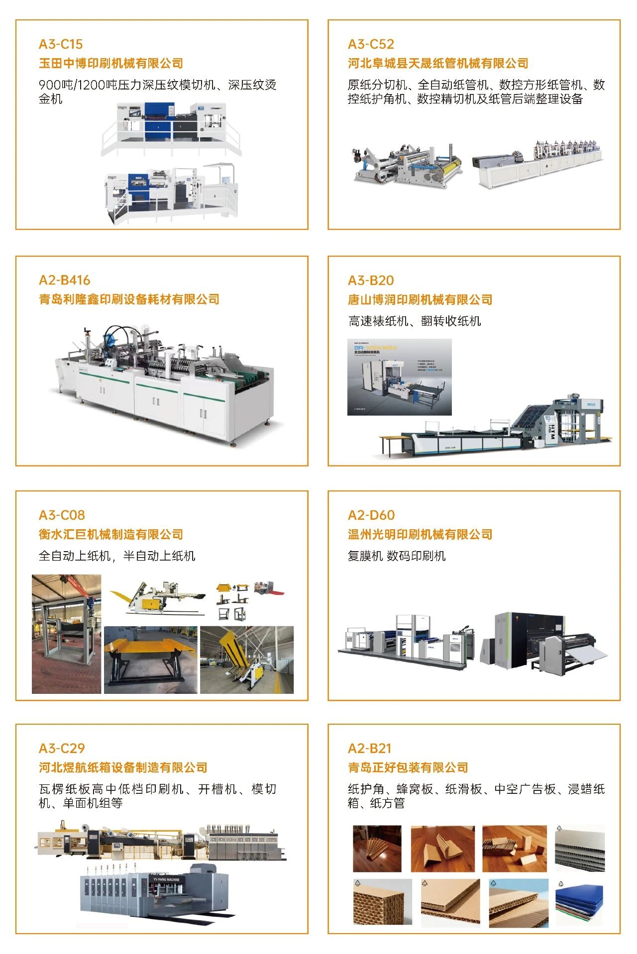 03看什么?聚焦“智造”与“绿动”? 展会深度聚焦智能制造、工业4.0、创新包装及可持续发展等热点,不仅看设备,更看趋势 。 ·印刷设备:数字印刷设备、印前处理设备、印后加工设备、印刷机械设备、油墨及耗材。 ·瓦楞纸箱/彩盒机械:瓦楞机、复瓦机、分纸机、接纸机、压痕机、纵切机、开槽机、粘箱机、钉箱机、制胶机、瓦楞辊、硬盒加工设备及其它设备。 ·智能包装机械:模切机、糊盒机、裱纸机、燙金机、激光切割机、贴窗机、上胶机、纸袋加工设备、胶盒加工设备、纸面处理设备、纸杯/纸盒自动生产线、喷胶系统、编码和识别系统。 ·标识标签:防伪标签解决方案、喷码机、激光打码机、热转印设备、条码机、贴标机、RFD标识系统、软件平台、标签印刷配件、条码识别系统。 ·包装成品及材料:艺术品包装、食品及饮品包装、医药及化妆品包装、珠宝首饰包装、烟草包装、服饰包装、特种纸/膜、包装设备配件、特殊印料。