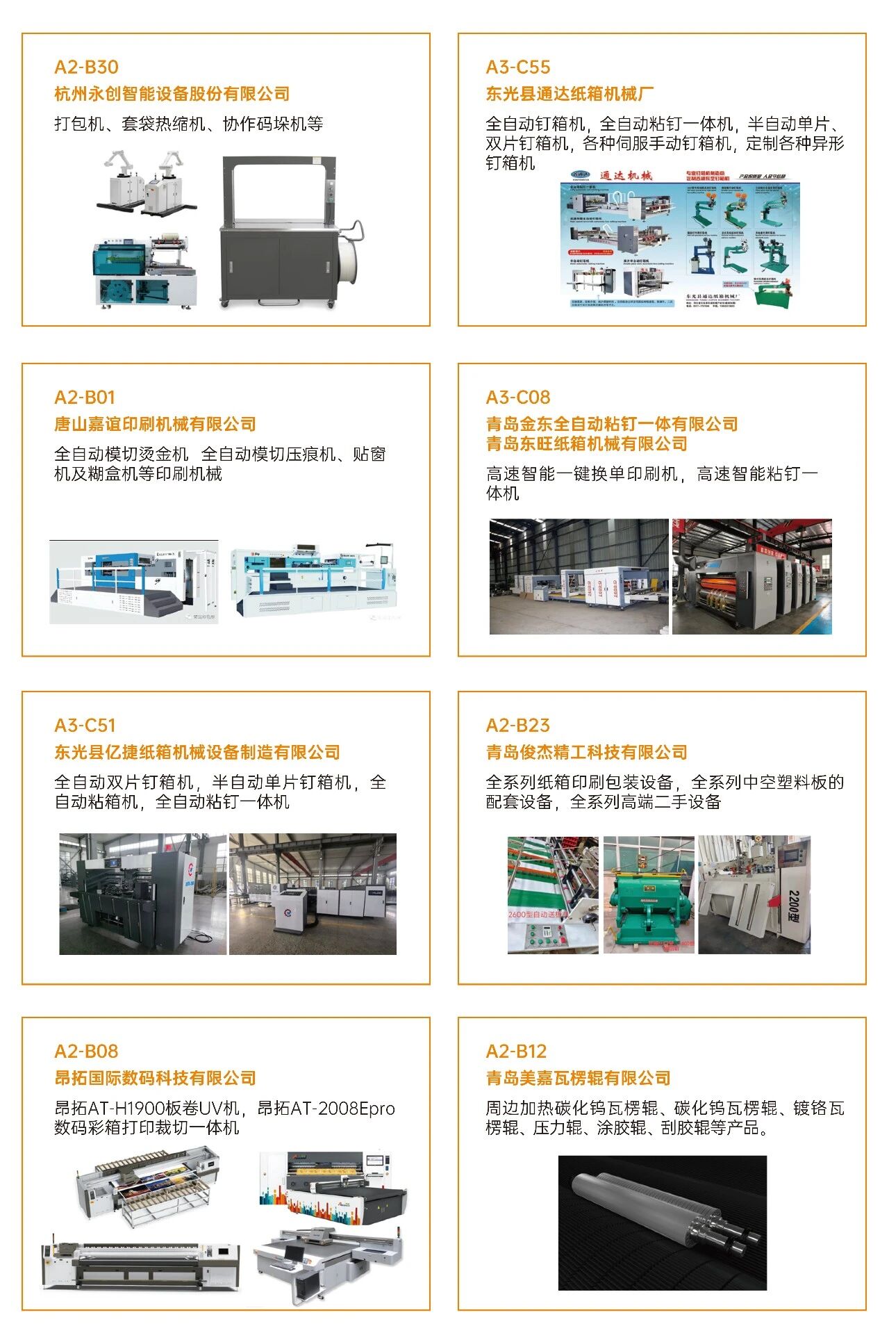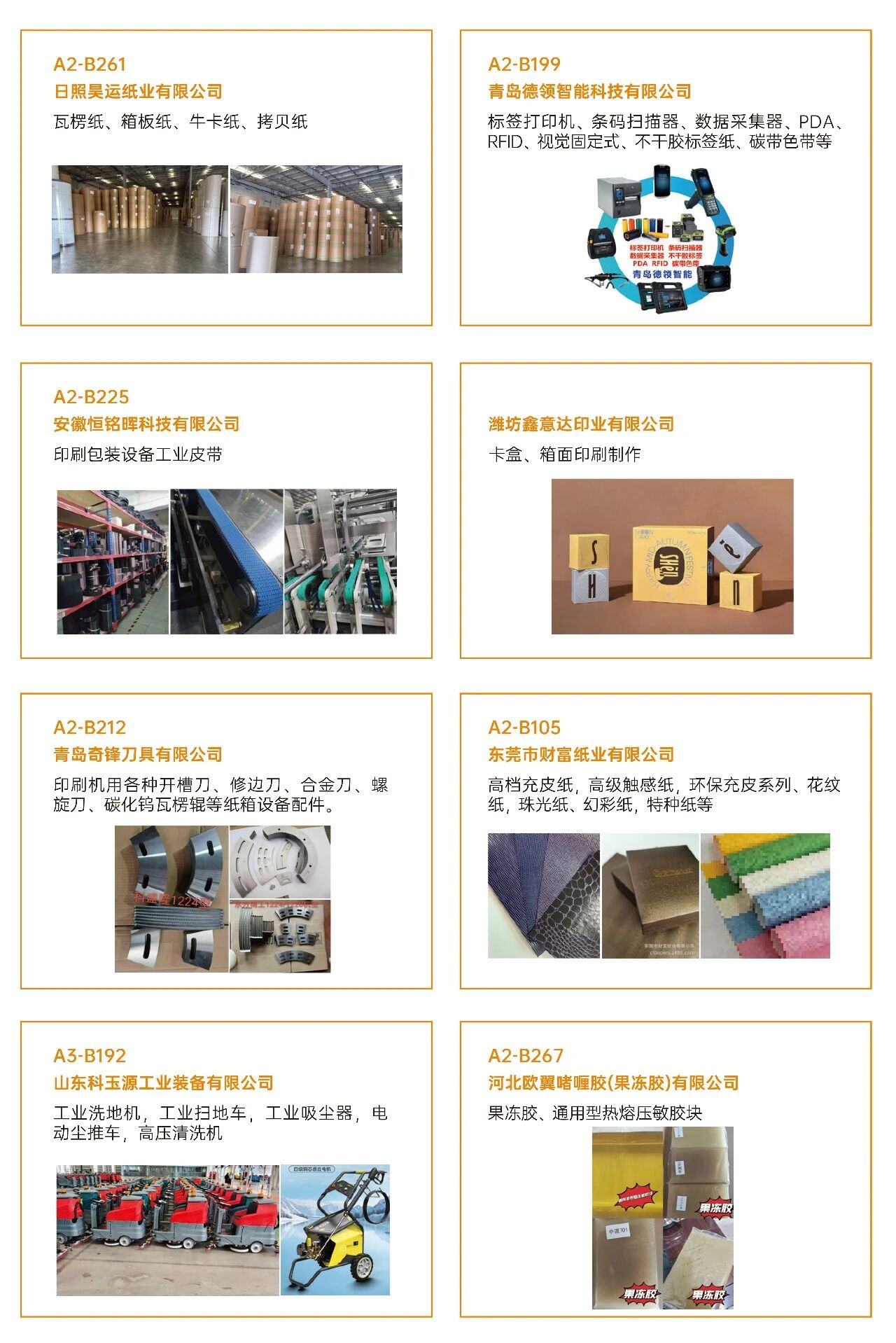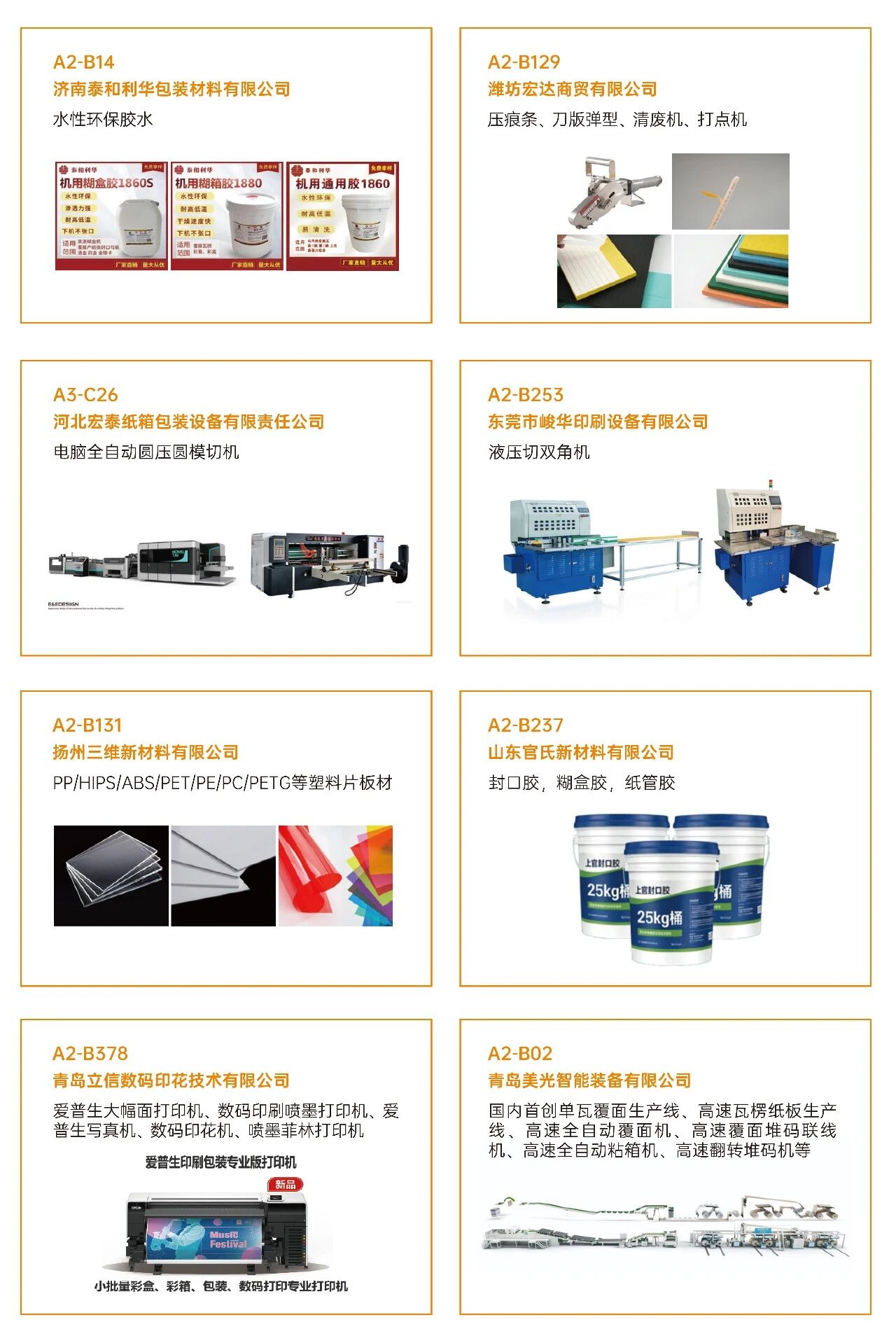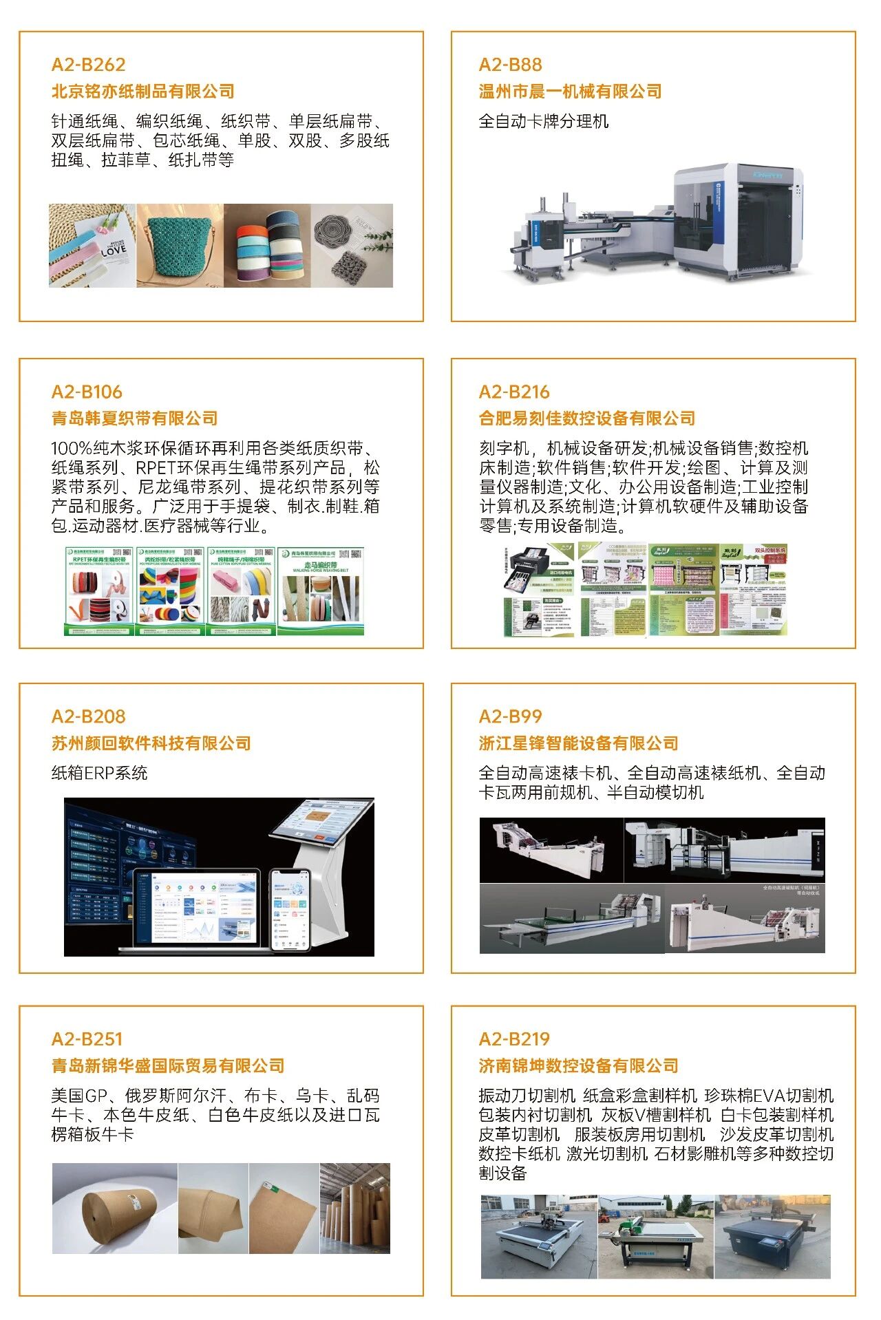 03看什么?聚焦“智造”与“绿动”? 展会深度聚焦智能制造、工业4.0、创新包装及可持续发展等热点,不仅看设备,更看趋势 。 ·印刷设备:数字印刷设备、印前处理设备、印后加工设备、印刷机械设备、油墨及耗材。 ·瓦楞纸箱/彩盒机械:瓦楞机、复瓦机、分纸机、接纸机、压痕机、纵切机、开槽机、粘箱机、钉箱机、制胶机、瓦楞辊、硬盒加工设备及其它设备。 ·智能包装机械:模切机、糊盒机、裱纸机、燙金机、激光切割机、贴窗机、上胶机、纸袋加工设备、胶盒加工设备、纸面处理设备、纸杯/纸盒自动生产线、喷胶系统、编码和识别系统。 ·标识标签:防伪标签解决方案、喷码机、激光打码机、热转印设备、条码机、贴标机、RFD标识系统、软件平台、标签印刷配件、条码识别系统。 ·包装成品及材料:艺术品包装、食品及饮品包装、医药及化妆品包装、珠宝首饰包装、烟草包装、服饰包装、特种纸/膜、包装设备配件、特殊印料。