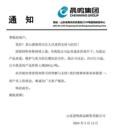 山东晨鸣纸品销售有限公司发布涨价函,因原材料价格持续上涨,公司决定,自4月1日起,白卡纸系列产品价格上调200元/吨。
