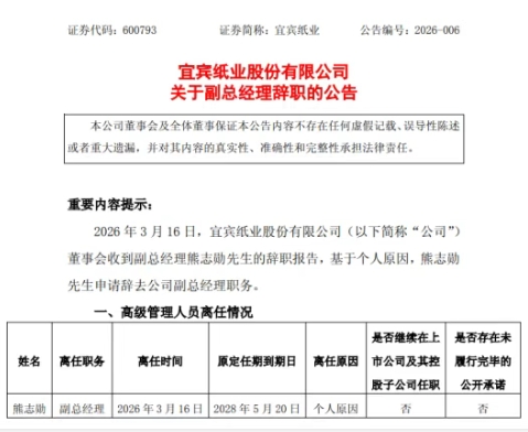 2026年3月16日,宜宾纸业股份有限公司(以下简称“公司”)董事会收到副总经理熊志勋先生的辞职报告,基于个人原因,熊志勋先生申请辞去公司副总经理职务。