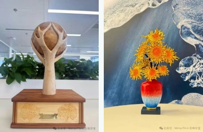 芬林芬宝与太阳纸业迎来合作 20 周年,在庆祝仪式上,双方互赠象征深厚情谊的纪念礼:芬林芬宝献上芬兰匠人手工木雕,森林托起由 20 层木块叠成的“太阳”,寓意二十年携手同行;太阳纸业回赠非遗铜艺作品向日葵,象征生命力量,也是“向阳而生”的美好祝福。