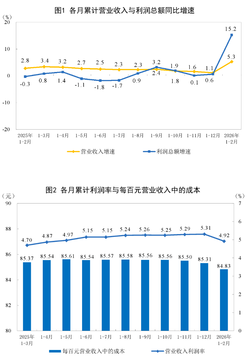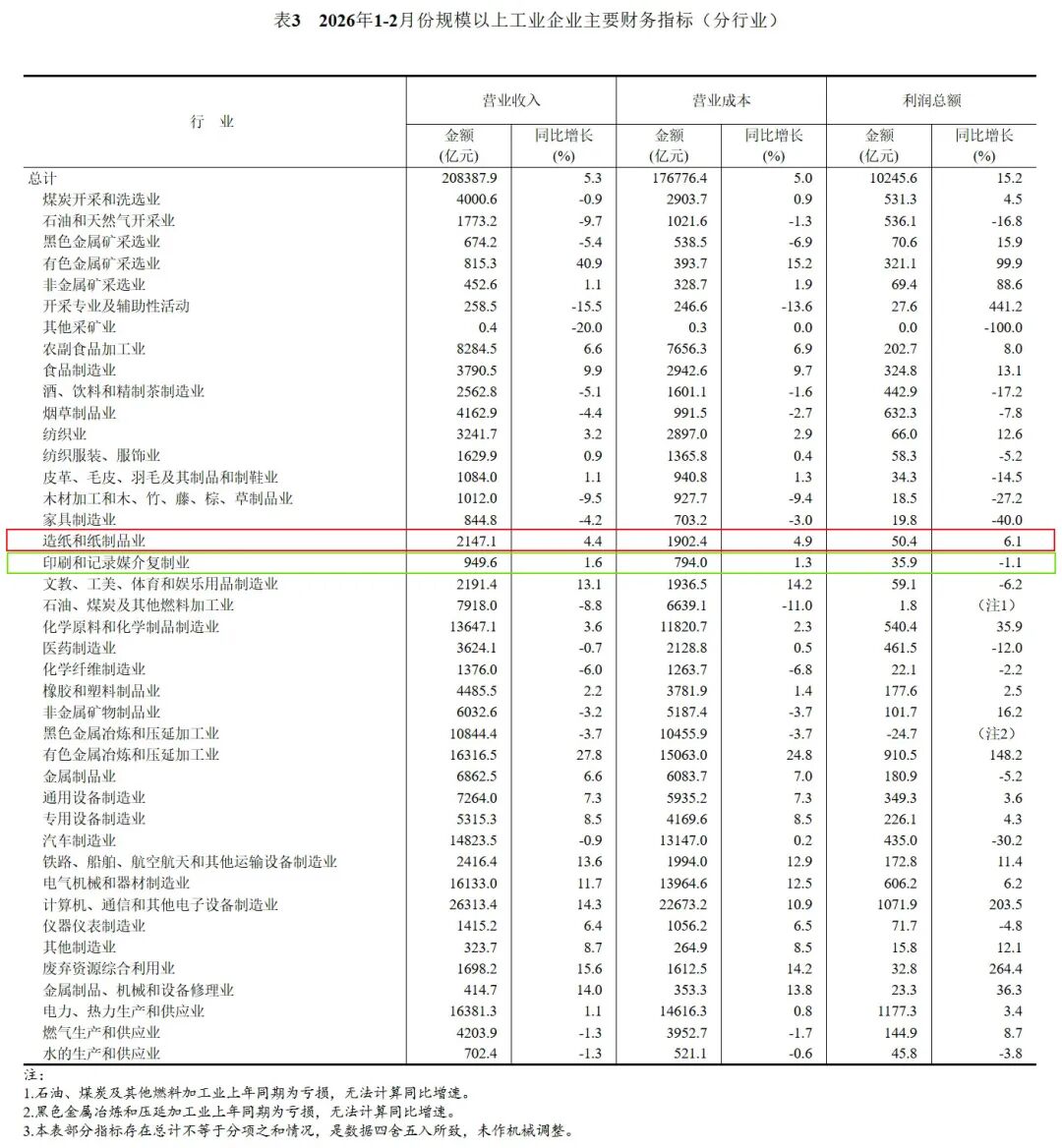 1—2月份,规模以上工业企业实现营业收入20.84万亿元,同比增长5.3%;发生营业成本17.68万亿元,增长5.0%;营业收入利润率为4.92%,同比上升0.43个百分点。其中,造纸和纸制品业实现营业收入2147.1亿元,同比增长4.4%;印刷和记录媒介复制业实现营业收入949.6亿元,同比增长1.6%。 2月末,规模以上工业企业资产总计188.40万亿元,同比增长5.5%;负债合计108.59万亿元,增长5.8%;所有者权益合计79.82万亿元,增长5.1%;资产负债率为57.6%,同比上升0.1个百分点。 2月末,规模以上工业企业应收账款26.55万亿元,同比增长7.1%;产成品存货6.68万亿元,增长6.6%。 1—2月份,规模以上工业企业每百元营业收入中的成本为84.83元,同比减少0.24元;每百元营业收入中的费用为8.66元,同比增加0.02元。 2月末,规模以上工业企业每百元资产实现的营业收入为66.4元,同比减少0.1元;人均营业收入为174.9万元,同比增加9.5万元;产成品存货周转天数为22.7天,同比增加0.4天;应收账款平均回收期为76.4天,同比增加1.3天。 国家统计局工业司首席统计师于卫宁解读2026年1—2月份工业企业利润数据表示,1—2月份,各地区各部门加紧实施更加积极有为的宏观政策,着力发挥存量政策和增量政策的集成效应,规模以上工业企业利润增长加快,多数行业利润回升,装备制造业和高技术制造业利润快速增长,工业企业效益状况呈现持续恢复态势。总体看,规模以上工业企业利润增长较快,但也要看到,国际环境跌宕起伏,外部风险特别是地缘政治冲突外溢风险上升,不稳定不确定性因素较多,同时国内经济转型期行业企业利润恢复仍不均衡。下阶段,要深入贯彻落实中央经济工作会议精神和全国两会部署,持续扩大内需、优化供给,因地制宜发展新质生产力,纵深推进全国统一大市场建设,推动工业经济持续健康发展。