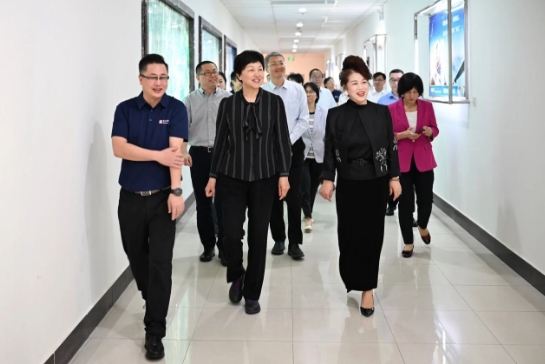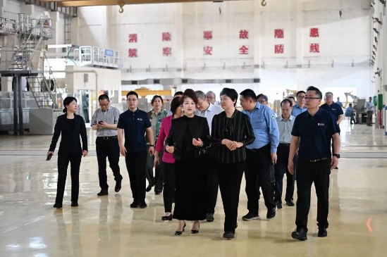 中央统战部副部长、国务院侨务办公室主任陈旭(前排右二),海南省副省长、儋州市委书记邹广一行参观海南金海浆纸生产车间