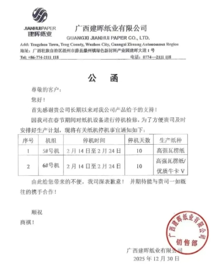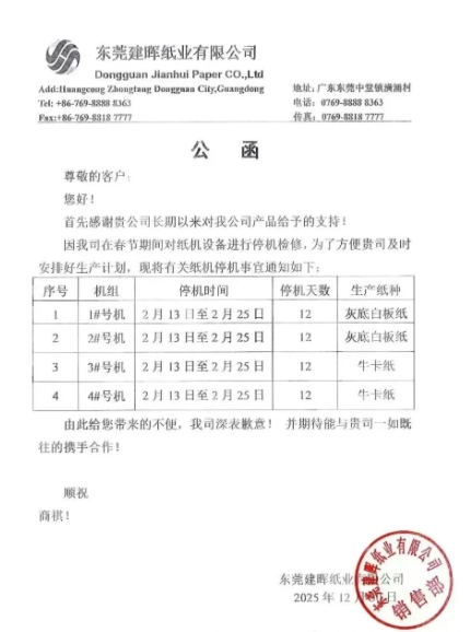 2025年12月30日,建晖纸业发布2026年春节检修计划,广东东莞和广西梧州两个基地全部六台纸机将在春节前后轮停10天或12天,按照设计产能计算,预计减产6.8万吨包装纸 ,其中包括2.8万吨灰底白板纸和4万吨箱板瓦楞纸。